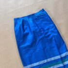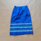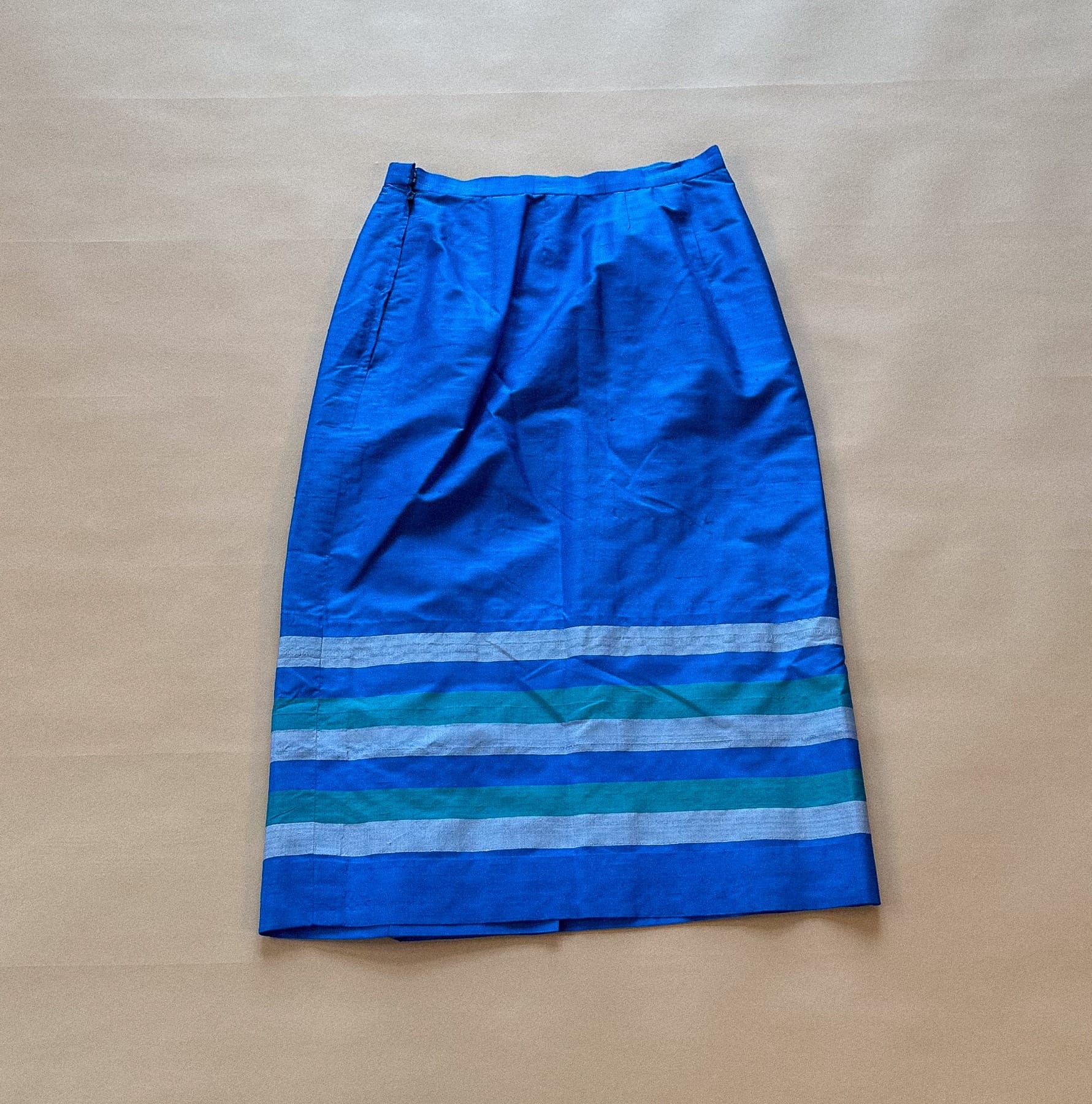 Nederdel i 100% Thai Silke. I smuk blå farve med usynlig slids foran og grønne og sølv striber i bund. Lynlås og knap i venstre side