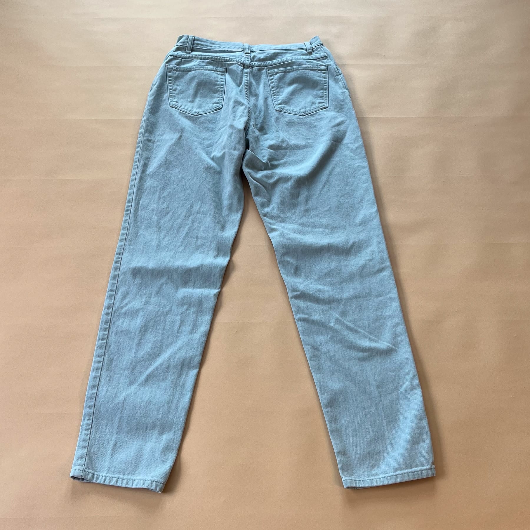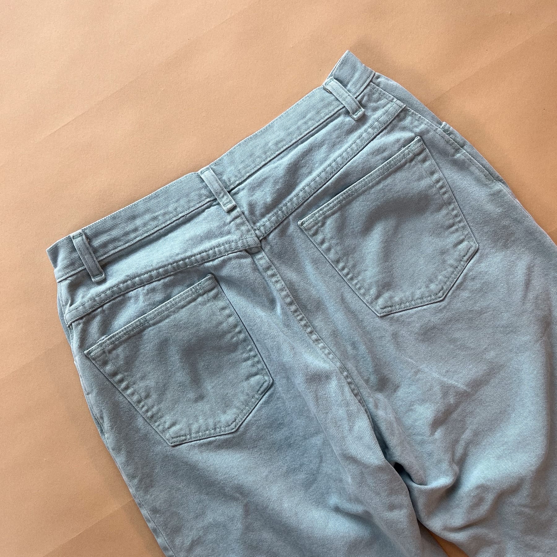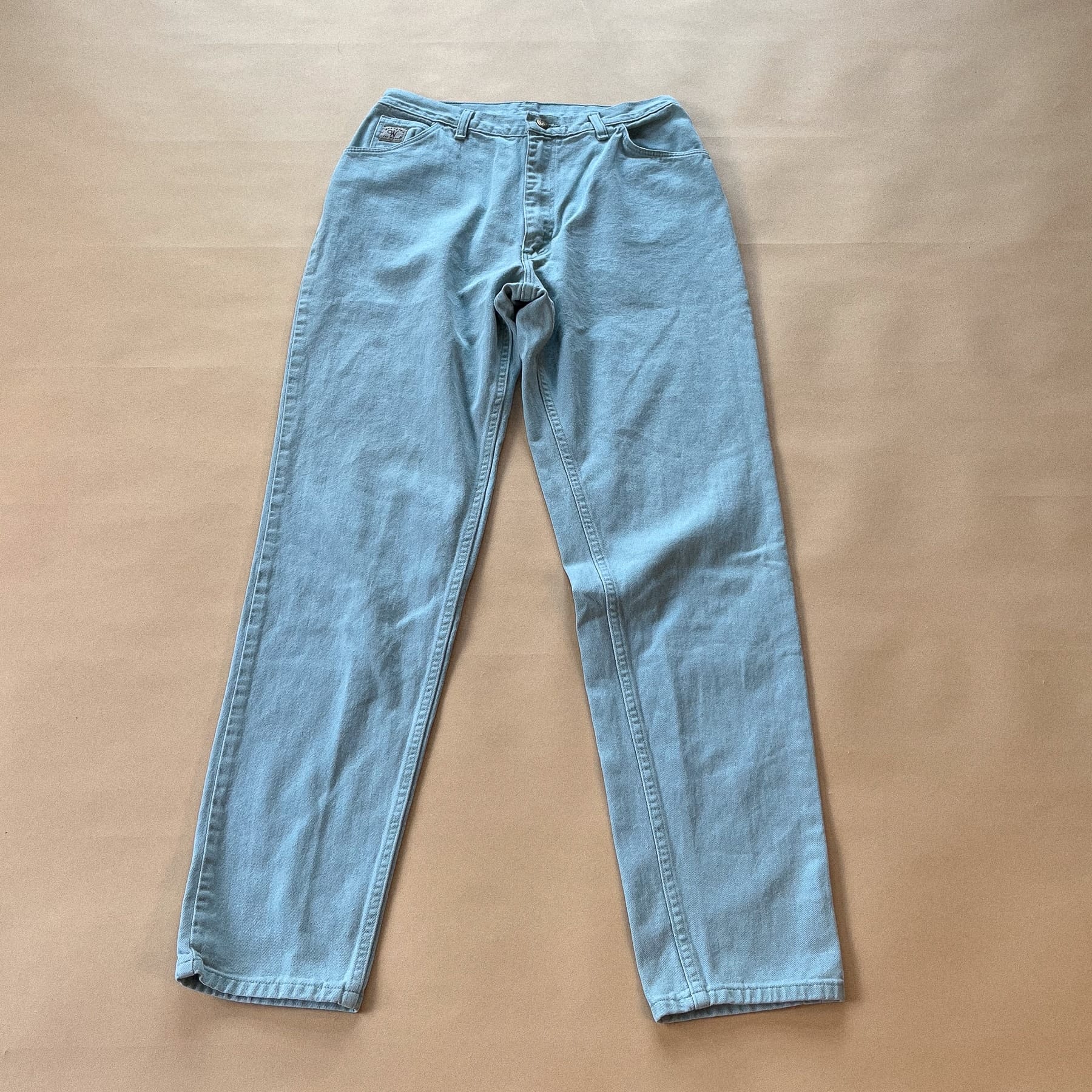 Wrangler lyseblå jeans. Lukkes med lynlås og én synlig knap.